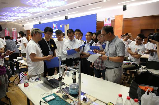 正式评审环节,大赛邀请到了清华大学基础工业训练中心主任李双寿教授、清华大学美术学院服务设计研究所付志勇副教授、北京大学信息科学技术学院网络与信息系统研究所边凯归副教授、北京大学信息科学技术学院罗英伟教授、英特尔中国研究中心研究员刘章林先生、康邦科技董事长王邦文先生、启迪之星创投副总经理徐静波先生、美科Microduino创始人王镇山先生、青橙创客教育创始人兼CEO李寅先生,以及北京联合大学机器人学院副院长马楠女士等学者及产业专家担任本次大赛评委。