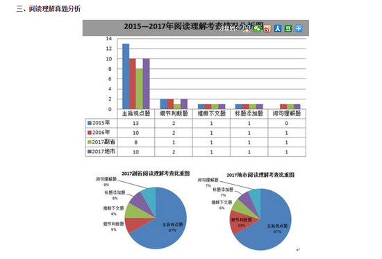 2017年副省级试卷比地市级多考查了10道文章阅读题目。文章阅读是2017年国家公务员考试新增题型,这是2017年国考的一大变化。文章阅读要主要考查考生对文章的整体理解、把握细节的分析。