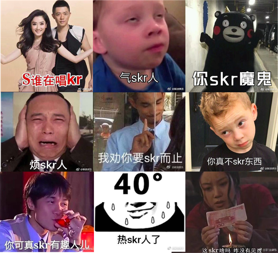 汉化后的[skr]也可假装很酷的调侃他人,如,“你[skr]丑东西”,“笑[skr]人了”,“我劝你[skr]而止” ,其中拟音为[是个]的频率最高。
