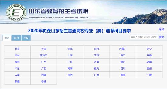 四、查询系统以地区、学校、科目三种方式分类展示。例如考生点击“地区”标签页,可以省份为单位选择查看高校招生专业(类)选考科目要求;考生点击“学校”标签页,可直接选择有关高校查看该校选考科目要求;考生点击“科目”标签页,系统可为考生呈现所有包含该科目要求的院校,考生从中选择某院校点击“查看”,显示内容为该校报送的所有专业(类)选考科目要求。考生还可以通过搜索栏输入院校名称,查看该校的选考科目要求。