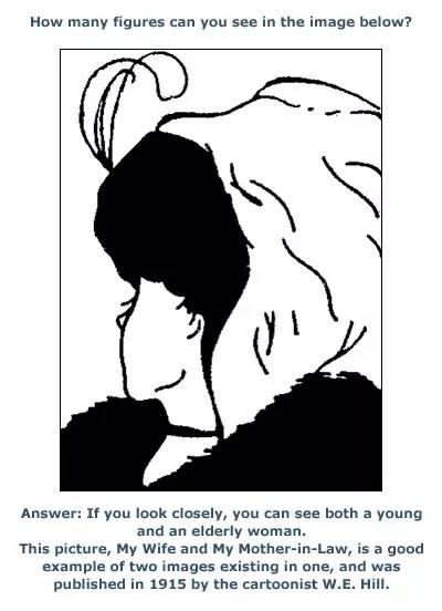 如果你看了很仔细,你会看到一位年轻女人和一位年长女士。这是一个经典的游戏了,这幅图诞生于1915年,由卡通画家W.E.Hill创作。