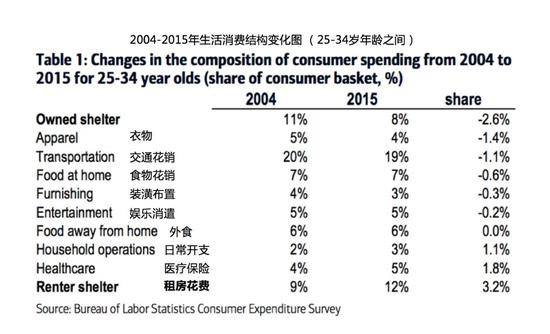 图中可以看到最后一项Renter Shelter(租房)近十年间从9%增长到了12%。越来越多的年轻人选择租房,在吃穿用度上增加生活质量。