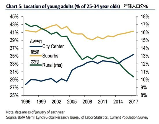 年轻人更喜欢选择在大城市定居和发展。下图为1996年-2017年中25-34岁成年人选择城市、郊区、农村的比例和趋势: