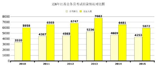 今年全省1605个单位共提供4253个职位,招录5872名公务员和参照管理单位工作人员,其中:省级256名、市级959名、县(市、区)级2182名、乡镇(街道)1732名、省以下垂直管理系统743名,县乡两级招录人数占总数的67%。从各地市来看,苏州、盐城、南通招录人数均超过500,苏州招录人数最多,为653人。从近6年招录情况来看,2015年招录人数与招录职位数创5年来新低。
