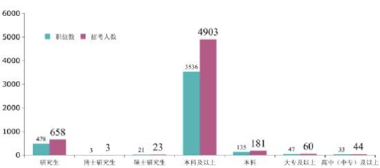 本次考试主要招录本科以上人员,明确要求“本科及以上”的职位供3536个,招录 4903人,占总人数的83%;明确要求“研究生”的职位共478个,招658人,占11%。省农委有3个A类职位,明确要求考生为博士研究生,中公教育专家建议符合条件的高学历人才可重点关注此三个职位,以避免过度竞争。