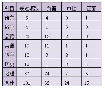 在历史以外的各个科目中,对人口的负面表述都要多于正面表述。负面表述从多到少的科目依次为地理、品德、英语、语文、科学、数学、历史。其中品德科目无一项正面表述。对人口中性的表述有24项,绝大部分为科学和地理中的概念介绍,以及地理中对中性观点的引述。