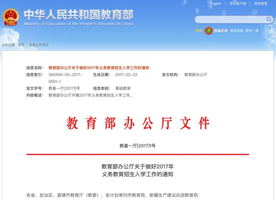 按照党的十八届三中全会总体要求和教育部统一部署,从2014年起,各地教育部门将义务教育免试就近入学改革作为深化教育综合改革的重要任务启动实施,经过三年持续大力推进,全国范围取得了阶段性成果和历史性突破,基本实现了免试就近入学、规范有序入学、阳光监督入学,有效缓解了“择校热”,有力促进了教育公平。为进一步巩固改革成果,持续提升治理水平,现就做好2017年义务教育招生入学工作通知如下。