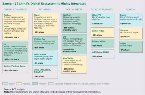 而另一方面,BAT主导的数字生态系统更方便消费者。商家在挤破脑袋分一杯羹的同时,阿里巴巴要提供工具和服务来扶持入驻店家,并设法对接消费者。而从电商、移动支付到社交网络、流媒体视频,BAT庞大的份额保证了其在大数据搜集方面的优势。
