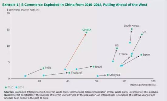 BCG整理的5年间中国电商与互联网渗透程度的图表显示,五年间,中国电商行业在零售业中的急速上升,而且,与发达国家相比,中国互联网的普及程度依然有很大提升空间。
