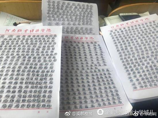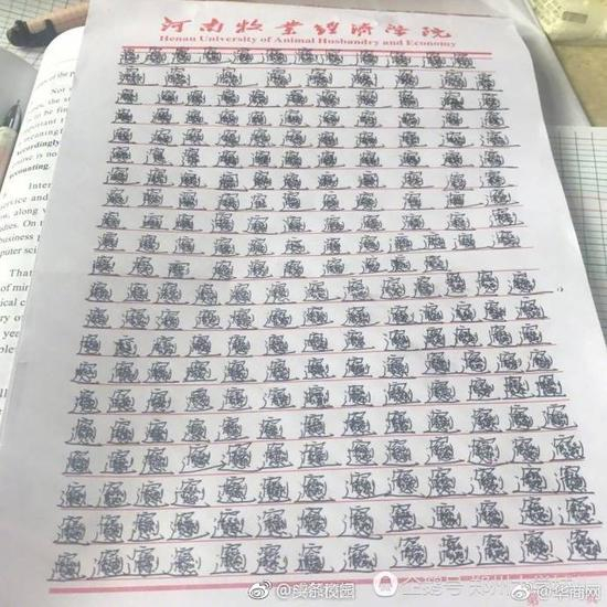 5月15日,有媒体报道称河南牧业经济学院某班级九名学生因为迟到被罚,被罚的形式也很特殊,要求迟到同学每人抄写1000遍“biang”字,“biang”字,一共56画,每个字大概要12秒才能写完。对此,有网友称赞老师有才,还有网友支招把笔粘成一排写,一次好几个!