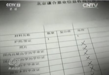 北京谦合嘉业公司负责人:找关系的,你以为拿这个做好递进去就成功了?留学服务中心是要跟对方学校调研的,为什么现在“一带一路”以后有46个国家做不了?因为跟他们已经有互认系统了。学位互认了,窗口都开了,你名单直接一输入,学校直接就能找到有没有你。