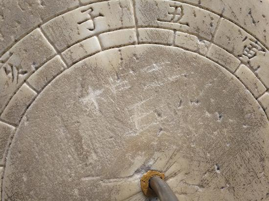 清华在校生向澎湃新闻提供的图片显示,刻画的痕迹位于晷面上半部分,笔画有十几条,在晷面上呈浅白色,十分突兀。