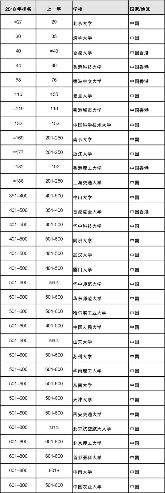泰晤士高等教育2018年世界大学排名 北大清华进前30