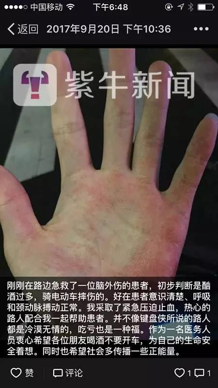 路人栽倒在地,后脑勺大量出血并伴有呕吐,情况危急!扶不扶?就读于南通大学附属医院普外科的硕士研究生、“90后”小伙儿刘家洲,不仅毫不犹豫大步向前,而且用医学所长顺利救下了伤者。这是9月20日晚,发生在南通市区工农路上的暖心事。抢救结束后,他无意中拍下一张自己沾染鲜血的手掌照片,很快刷爆了朋友圈。和他一起停下脚步参与抢救的外卖小哥、不顾伤者满身血迹和呕吐物的的哥、还有帮助将伤者一起抬上车并送往医院的路人……虽然他们都没有留下名字,但看似偶然的举动却散发出人性的光辉,也温暖了南通这座全国文明城市。