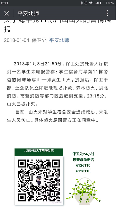 1月3日22时,北京师范大学珠海分校海华苑11栋附近后山发生火情,过火面积约200平方米。至22时50分已全部扑灭,无人员伤亡。据珠海市市政和林业局通报,学生在校内篮球场拍摄小视频,用火不慎,发生火情。