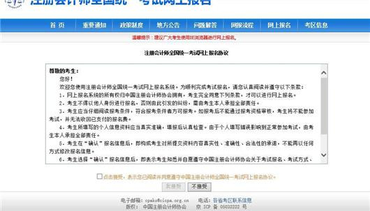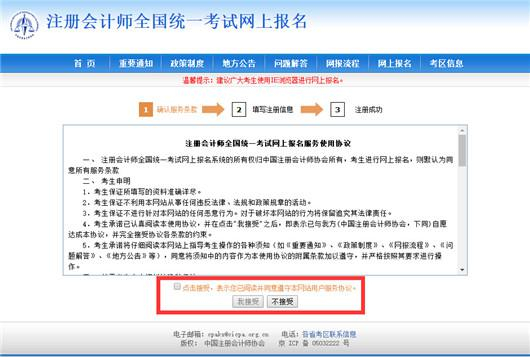 3、阅读“注册会计师全国统一考试网上报名服务使用协议”,如果接受,点击“我接受”按钮,进行下一步。