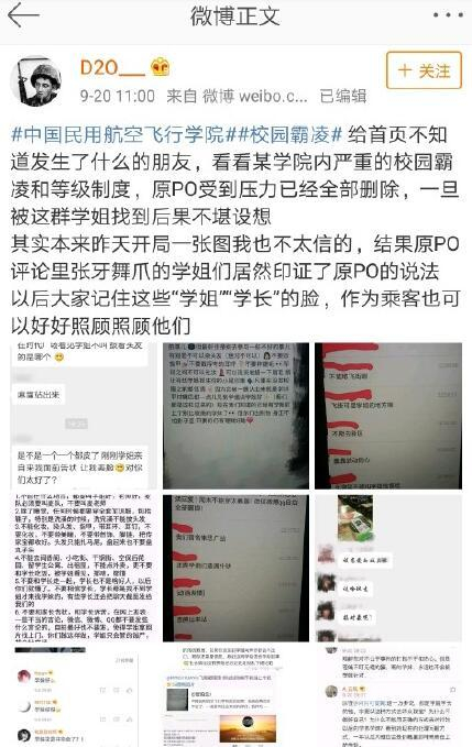 9月19日下午,一名自称中国民用航空飞行学院大一女生的网友发帖称学校“出现校园霸凌”,入校后受不了学姐森严的等级制度,被学姐欺压。在该新生贴出的图片中,有“见到学姐必须叫‘学姐好’”的规定,并有人在微信群里用文字教训不主动向学姐问候的学妹。在其他图片中,学姐称军训期间不能化妆、戴美瞳、染头发和涂指甲。第二天下午,校方回应称高度重视,立即展开调查。经调查得知发帖人实为18级非空乘专业男生,入校后发现与自己想象中的大学有差距,于是网上发帖宣泄,配图内容为往届个别学生自撰的“新生入学须知”。所以,不存在所谓“学姐为学妹立下种种规矩”之说。