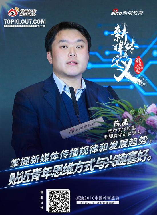 团中央学校部新媒体中心负责人陈潇作了“团学新媒体运营探索与实践”的主题演讲。他认为,团中央学校部新媒体运营的“成绩”离不开“明确一个定位、融入两个大局、培育四种能力、做好五项工作”的方法。【陈潇:团学新媒体运营探索与实践】http://edu.sina.com.cn/l/2018-11-27/doc-ihmutuec4086947.shtml