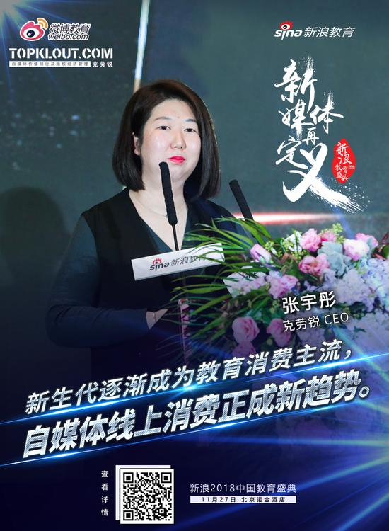 克劳锐CEO张宇彤分享了教育品牌的社交平台焕新之道,她指出,“自媒体线上教育消费正成新趋势”。【克劳锐张宇彤:自媒体线上教育消费正成新趋势】http://edu.sina.com.cn/l/2018-11-27/doc-ihpevhck9764749.shtml