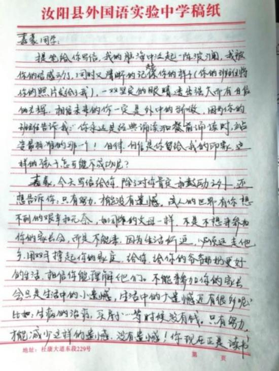 12月11日,李嘉豪的班主任徐红彩表示,11月底班里开家长会,要求每名学生给父母写一封信,会上再发给家长。李嘉豪的父母因为在外打工没来,只有他的信没有人领。当时她将这封信读与在座的家长听,大家都十分感动。