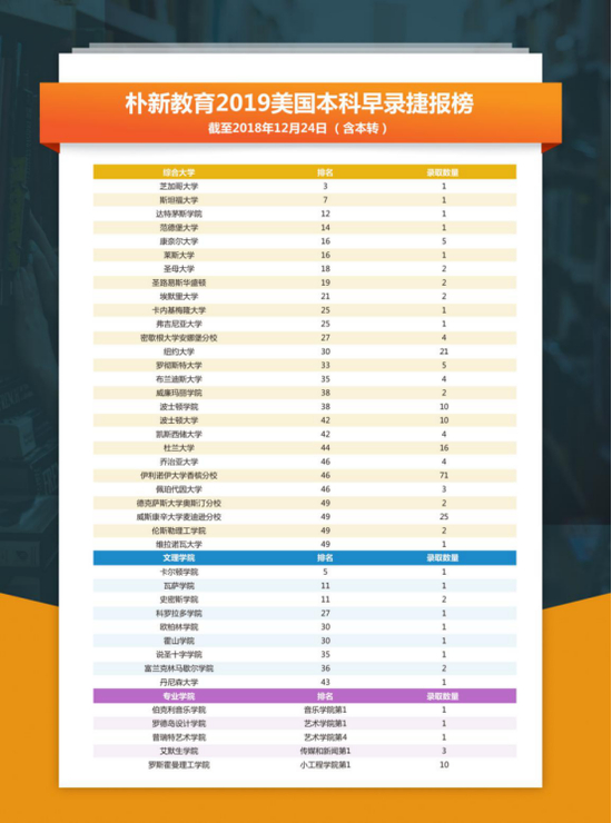 令人欣喜的是,截止到12月底,朴新啄木鸟教育共斩获229枚美国本科TOP50 EA/EA早录取offer,其中不乏录取率较低的芝加哥、斯坦福、达特茅斯、莱斯、圣母、卡尔顿学院和纽约大学阿布扎比分校等等。啄木鸟学员获得的每一个早录取捷报背后,都凝结着学生、家长和老师们巨大的付出。同时也彰显着朴新啄木鸟在美国名校申请上扎实的专业水准和深厚的实力。