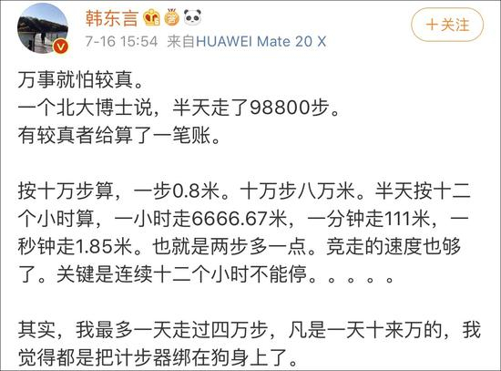 近日,北大一博士生自称由于微信运动步数限制,98800步只是自己半天的步数。有网友质疑,半天走10万步,平均下来一秒钟走1.85米,也就是两步多一点,可连续12个小时保持这种速度不合常理,也有网友认为优秀的人做什么都优秀,令人羡慕。18日,相关话题还登上了微博热搜。