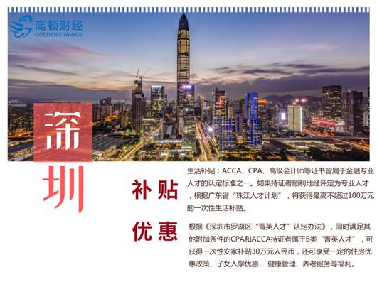 这里高顿cpa小编就不再详细的罗列。其实,从上面不难看出,深圳对注册会计师的补贴已经很明显了,“将注册会计师纳入人才安居房保障范围”,这也就预示着,注册会计师在深圳就业会享受到相应的住房补贴等。
