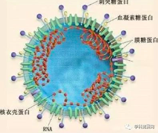 冠状病毒外有包膜,这层包膜主要来源于宿主细胞膜(磷脂层和膜蛋白),但也包含有一些病毒自身的糖蛋白。膜表面有三种糖蛋白:刺突糖蛋白(S,是受体结合位点、溶细胞作用和主要抗原位点)、小包膜糖蛋白(E,与包膜结合的蛋白)、膜糖蛋白(M,负责营养物质的跨膜运输、新生病毒出芽释放与病毒外包膜的形成),少数种类还有血凝素糖蛋白(HE蛋白)。而冠状病毒的核酸为单股正链RNA。
