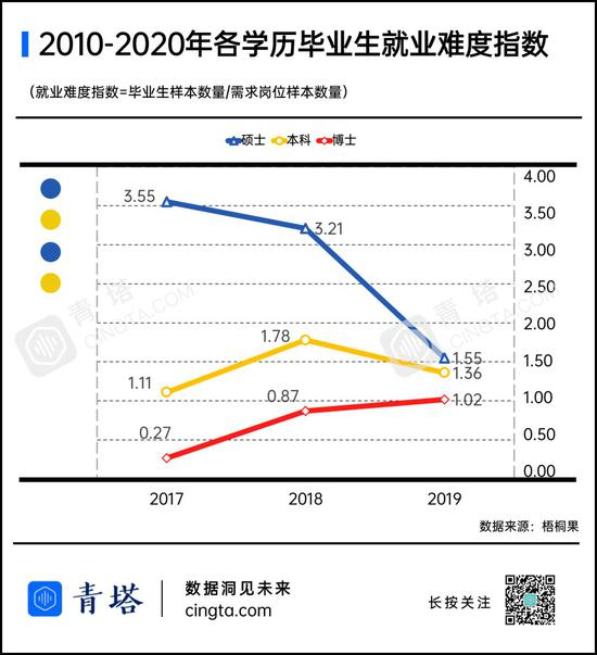 据相关机构统计,各学历层次中,硕士研究生的就业难度指数本就异军突起。在2017、2018年平均都会有超过3名硕士生竞争1个岗位。这一比例在2019年有所下降,但仍然高于本科和博士生。