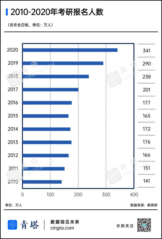 2020年,考研报名人数首次突破300万,达到了史无前例的341万。较上一年度增长了约51万人,增长率约为17.59%,在近5年,乃至近10年间,也是增长率较高的一年。