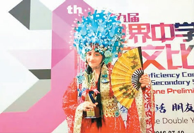 善真参加2016年“汉语桥”世界中学生中文比赛时,戴着和家人用1个月做成的头饰进行才艺展示。