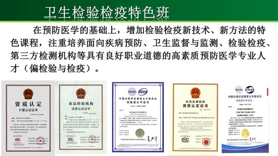 我们第二个特色班是卫生检验检疫特色班,这个特色班增加了检验检疫新技术新方法等等这样一些课程,注重培养面向疾病预防、卫生监督与检测、检验检疫、第三方检测机构等等这样方向的相关课程。主要的课程包括卫生检验检疫学、分析化学、仪器分析、卫生检验综合,我们通过这样一个特色班的学习,就能够胜任未来的检验和检疫工作。我们支撑这个特色班的教学单位也是非常的强大,主要是卫生检验检疫学系。另外它也是我们学校的卫生检测中心,这个检测中心获得了国家的一系列的资质,包括国家实验室资质认定、食品检验机构资质认定、国家实验室认可委员会的认可,我们这样一个机构出具的报告,不仅在国内是能够通过的,很多其它国家也是认可我们这样一个检测的结果。另外我们检验检疫学系还可以开展法医的临床司法鉴定和法医的病理司法鉴定。所以通过在这个专业方向的学习,在卫生检验检疫应用方面,一定会非常的专业。