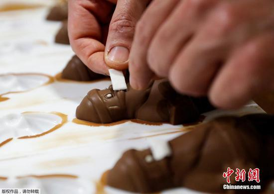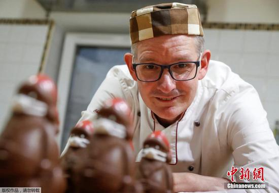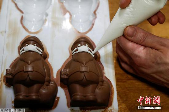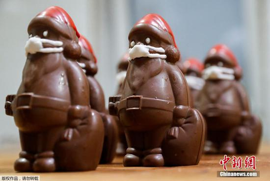 当地时间11月20日,新冠疫情持续期间,匈牙利糖果商Laszlo Rimoczi在他的车间里为巧克力圣诞老人“戴上口罩”。