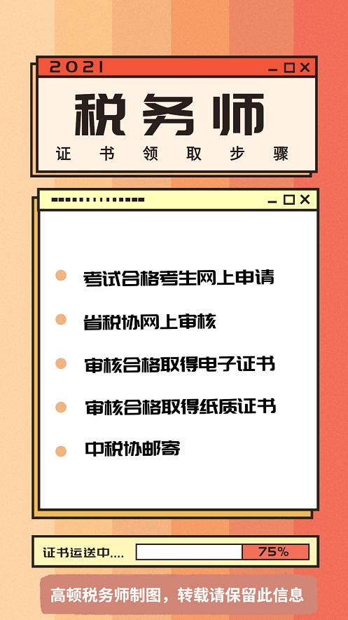 综上,税务师证书领取时间一般会定在考试结束后的第二年4、5、6月份,而2020年度税务师证书申领时间2021年1月20日开始,比往年提前了不少!但是证书领取的时间限制也相对缩短了,只有将近两周时间。