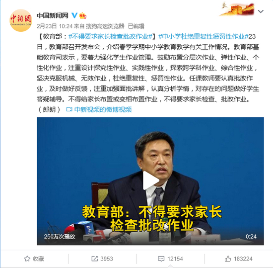 教育部基础教育司表示,要着力强化学生作业管理。鼓励布置分层次作业、弹性作业、个性化作业,注重设计探究性作业、实践性作业,探索跨学科作业、综合性作业,坚决克服机械、无效作业,杜绝重复性、惩罚性作业。任课教师要认真批改作业,及时做好反馈,注重加强面批讲解,认真分析学情,对存在的问题做好学生答疑辅导。不得给家长布置或变相布置作业,不得要求家长检查、批改作业。