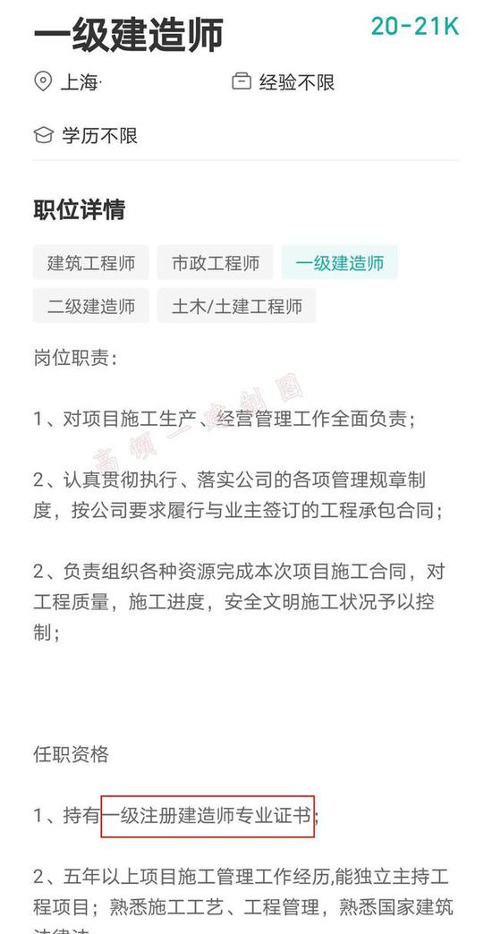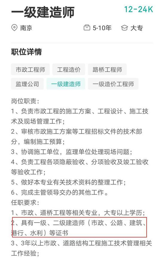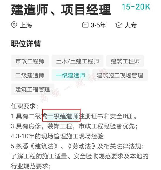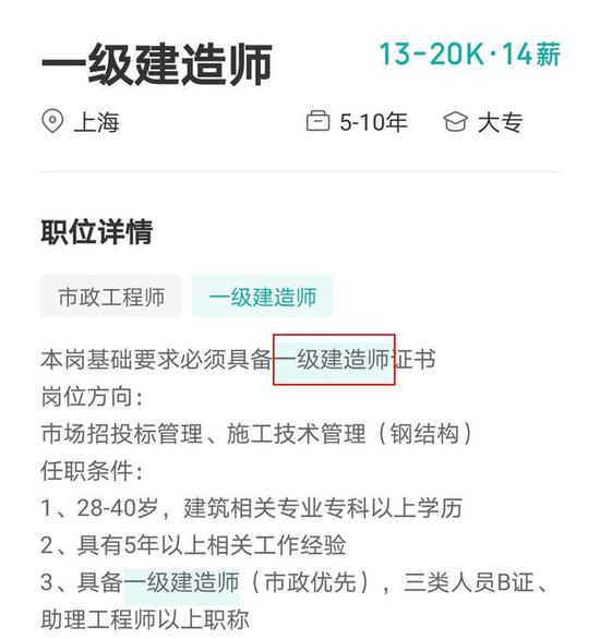 我国基建行业具有庞大要求,对于持有一级建造师这类的人才更是需求量攀升,根据政策要求,一级建筑工程企业需要不少于12个建筑工程、机电工程专业一级建造师,其中建筑工程专业一级建造师不少于9个;一级公路工程企业需要不少于15个公路工程专业一级建造师。