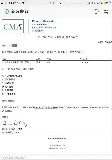 北京考生张明宇以p1 440 p2 450的成绩获取IMA成绩优异奖!