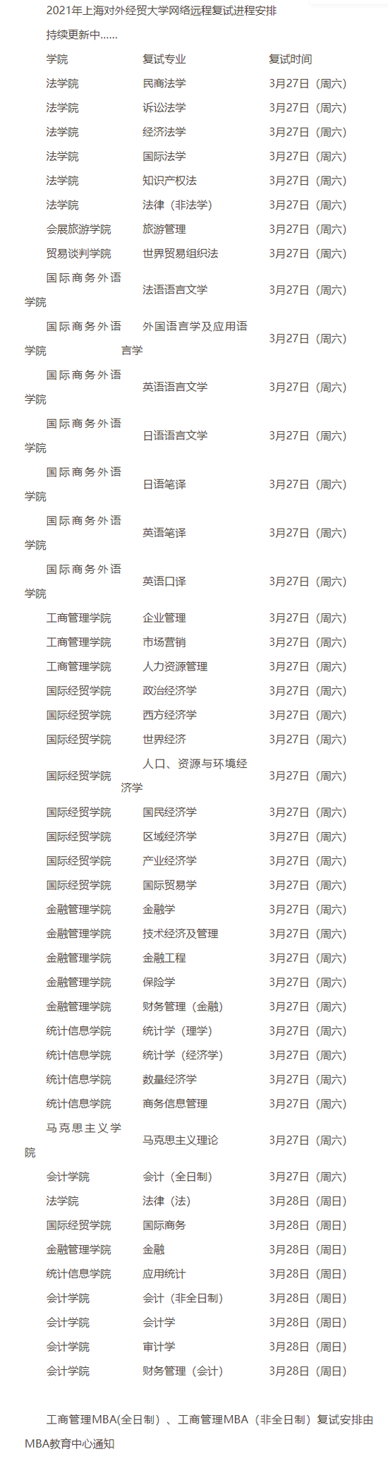 上海对外经贸大学2021年硕士研究生招生复试安排