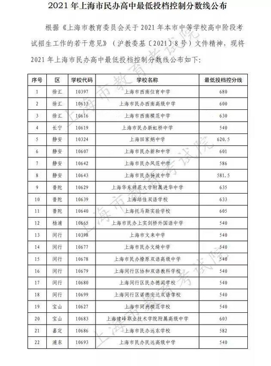 上海市教育考试院公布2021年上海市民办高中最低投档控制分数线。