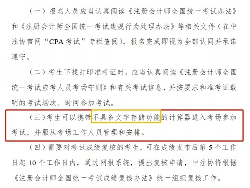 好消息,在中注协公布的最新CPA报名简章中,明确规定了2021年CPA考生“可以携带不具备文字储存功能的计算器进入考场参加考试,并服从考场工作人员管理和安排。”
