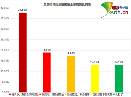 像由小雨一样认为因为圈子小而导致单身的硕博不在少数,调查中,在被问及造成自己单身的最大原因是什么时,37.8%的受访者选择“圈子小,没机会认识异性”,其次是“眼光高,难遇满意的”“性格原因,不会相处”和“自身条件不够优越”,分别占比18.9%、17.2%、13.1%。此外,还有13.1%的受访者表示自己太忙了,没时间。