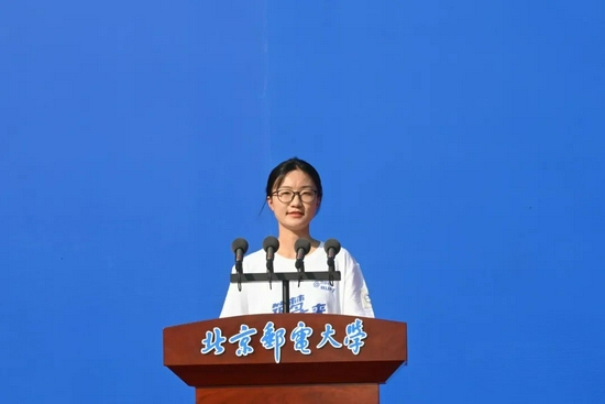 电子工程学院程淑敏同学代表全体新生发言,她表示作为一名新“北邮人”,要提升文化素养、磨炼专业技能、丰富自身阅历、修行个人品格,在“团结、勤奋、严谨、创新”的校风中始终保持昂扬向上的姿态,共同续写“传邮万里,国脉所系”的辉煌与荣光。