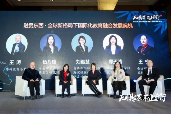 海嘉中文校长兼教育研究院副院长伍丹履、青苗国际双语学校海淀校区初高中部中方校长刘迎慧、北京市中芯学校教学副校长郑玉清、金吉列留学高级副总裁王宁出席本次国际教育峰会,并就“融贯东西·全球新格局下国际化教育融合发展契机”展开讨论,各抒己见。