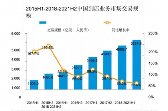 据艾瑞咨询数据显示,本地生活服务市场规模将从2020年的19.5万亿元,增长到2025年的35.3万亿元,本地生活服务线上渗透率也将由2020年的24.3%,增至2025年的30.8%。易观千帆的数据也显示,截止2021年上半年,本地生活到店业务市场交易规模较2015年同期翻了五倍,达到5287.6亿,且过去几年维持着20%以上的同比增速。