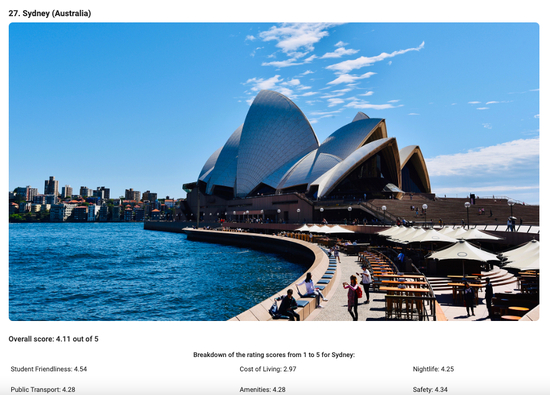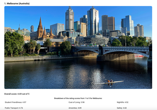 墨尔本是澳大利亚第二大城市,同样也是维多利亚州首府,每年都会吸引众多国际生来此就读。近日全球教育网站THE CAMPUS ADVISOR发布的《2022年全球最佳留学城市》排名中墨尔本位列第一,悉尼位于27位。而在6月22日英国经济学人智库发布的“2022年全球最宜居城市”排行榜中墨尔本位居第十,也是澳洲唯一一个进入Top10的城市,成为全世界最宜居城市之一。同样也是留学生最青睐的澳洲城市。