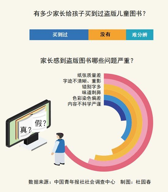 上周,中国青年报社社会调查中心联合问卷网,对1144名家长进行的一项调查显示,47.6%的受访家长都买到过盗版儿童图书,还有22.0%的受访家长表示不清楚,“难分辨”。电商平台网站是家长购买儿童图书的第一大渠道。67.7%的受访家长担心劣质图书对孩子生长发育造成伤害。