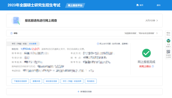 7、根据管理规定要求,所有参加硕士研究生招生考试的考生均须在网上确认网报信息和采集本人图像等相关电子信息,请考生完成报名后,关注后续报考安排,提前做好招生单位要求的各项材料准备。网上确认时间由各省级教育招生考试机构根据国家招生工作安排和本地区报考组织情况自行确定和公布。
