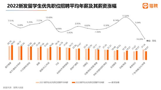 从新发留学生优先岗位的行业薪资来看,最高的是医疗健康,招聘平均年薪为30.92万元,比上年增长7.51%。电子/通信/半导体位居第二,为28.34万元;IT/互联网/游戏、金融的薪资位居第三、第四,为27.99万、27.36万元。从薪资涨幅来看,机械/制造幅度最大,从2021年的16.35万元增长到2022年的19.21万元,增长了17.50%,其次是能源/化工/环保,从2021年的23.92万增长到2022年的26.96万元,涨幅为12.69%。
