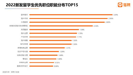 从2022年新发留学生优先职位的职能分布TOP15来看,位居前四的是留学生顾问、海外市场、外语教师和总助,这些岗位均可充分发挥留学生海外生活、学习优势的岗位。值得注意的是,近年来的新兴岗位如海外运营、跨境电商运营也跻身TOP15,位居第六、第十。、