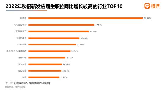 下半年是应届生秋招的重要时期,猎聘调研显示,三季度76.57%的企业已开启了秋招。整个2022年秋招应届生就业机会在哪里?根据猎聘大数据, IT/互联网/游戏、电子/通信/半导体、机械/制造、医疗健康行业新发应届生职位位居全行业前四,占比为16.88%、12.35%、11.81%、9.15%。从占比增幅来看,机械/制造增长最多,上升了3.30个百分点;电子/通信/半导体、能源/化工/环保占比增幅位居第二、第三,增长了3.23、2.87个百分点。